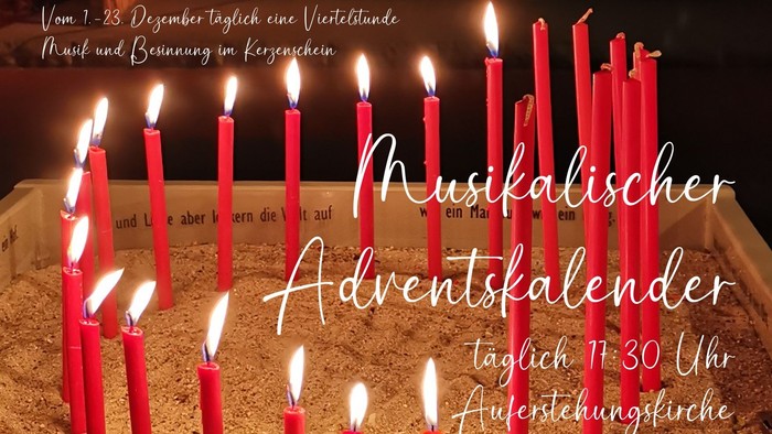 Auch in diesem Jahr ist um 17:30 Uhr an jedem Tag bis zum 23. Dezember Zeit für eine kleine adventliche Unterbrechung des Alltags. In der Auferstehungskirche, Flurstr. 3. Für jeweils eine Viertelstunde. Im Kerzenschein erklingt Musik unterschiedlicher Musizierender aus Lurup, wird ein Adventslied gemeinsam gesungen und es gibt einen kleinen adventlichen Impuls. Vor und nach der „Adventskalender-Zeit“ besteht auch die Möglichkeit, die Ausstellung von Krippen unterschiedlicher Länder der Erde zu betrachten. Am 3. Und 4. Adventssonntag gibt es größere musikalische Angebote mit Chören und Solisten, die eine halbe Stunde später, um 18:00 beginnen. Der Eintritt ist frei. Spenden am Ausgang sind willkommen.